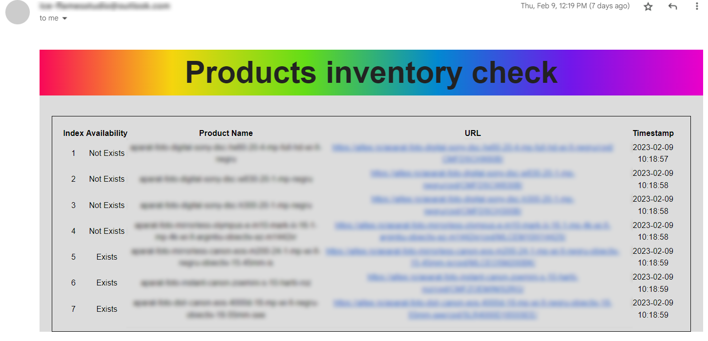 Once the check is completed, the system automatically sends the table via email, allowing users to quickly see which products are available and when the check was performed.